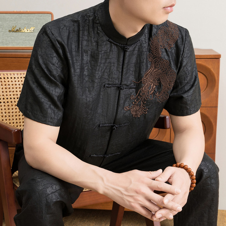 香云纱重磅提花短袖衬衫男士休闲时尚桑蚕丝短袖衬衫